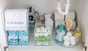 Actually, what I first saw was all of “it”. Approximately two dozen razor replacements, dozens of packets of eye glass cleaner, no fewer than three combs, two antiperspirants and two tubes of toothpaste. I looked deeper into the cupboard and saw more of the same – various never-opened or partly-used bottles of hair products, four or five bottles of bathroom cleaning products, and of course four rolls of toilet paper.