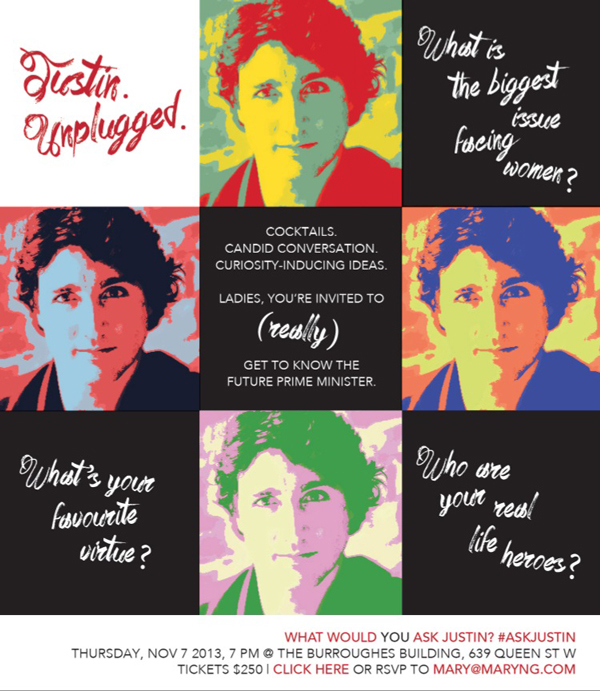 I actually don’t object to the word “ladies” (although it does hearken back to the days when the adjective “little” was included in this kind of thing). But the whole image and tenor of the event would be more appropriate if women were being invited to get to know Justin Bieber instead of Justin Trudeau. Or if Justin Trudeau was opening a dating service and wanted to launch the business by populating his “lady” databases with Liberal socialites.