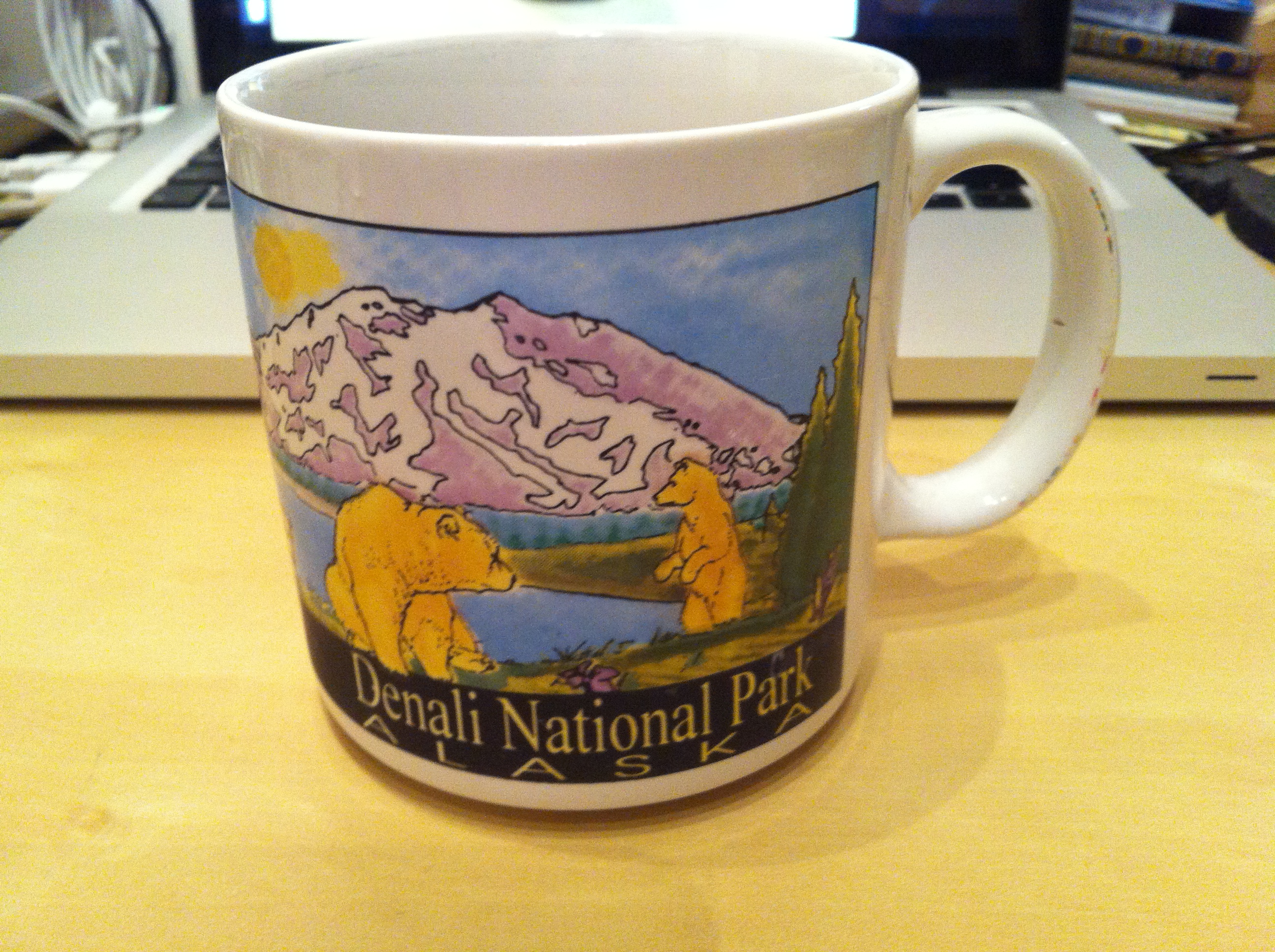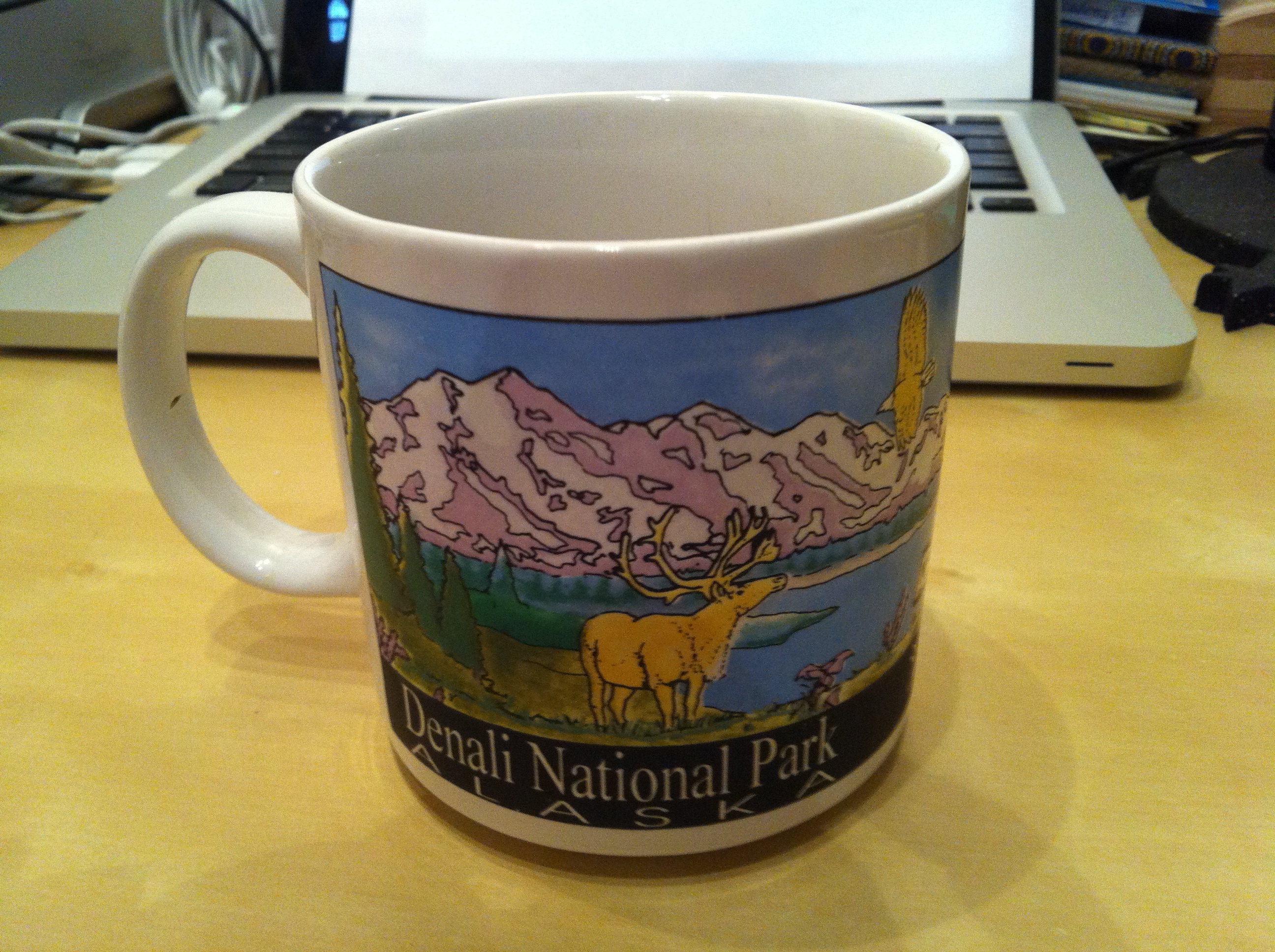 Mugs are familiar keepsakes from tourist locations and travels everywhere. I have a few, but this one is my most precious and the oldest. As shown, it comes from Denali National Park, the centre point of my 6-week road trip in 1993 from Vancouver, through Yukon and around Alaska, and back through Alberta to home. I have so many memories from that trip, and it was a major milestone event in my life – a declaration of independence, a true adventure, a unique opportunity to see the wonders of the wilderness, times with new friends and old, and a whole lot of fun. Denali Park was not an objective, but it gave my trip structure as a significant destination, and rewarded me by offering up quintessential elements of a trip into the wild – moose, bears, eagles, and of course, mosquitoes.