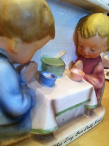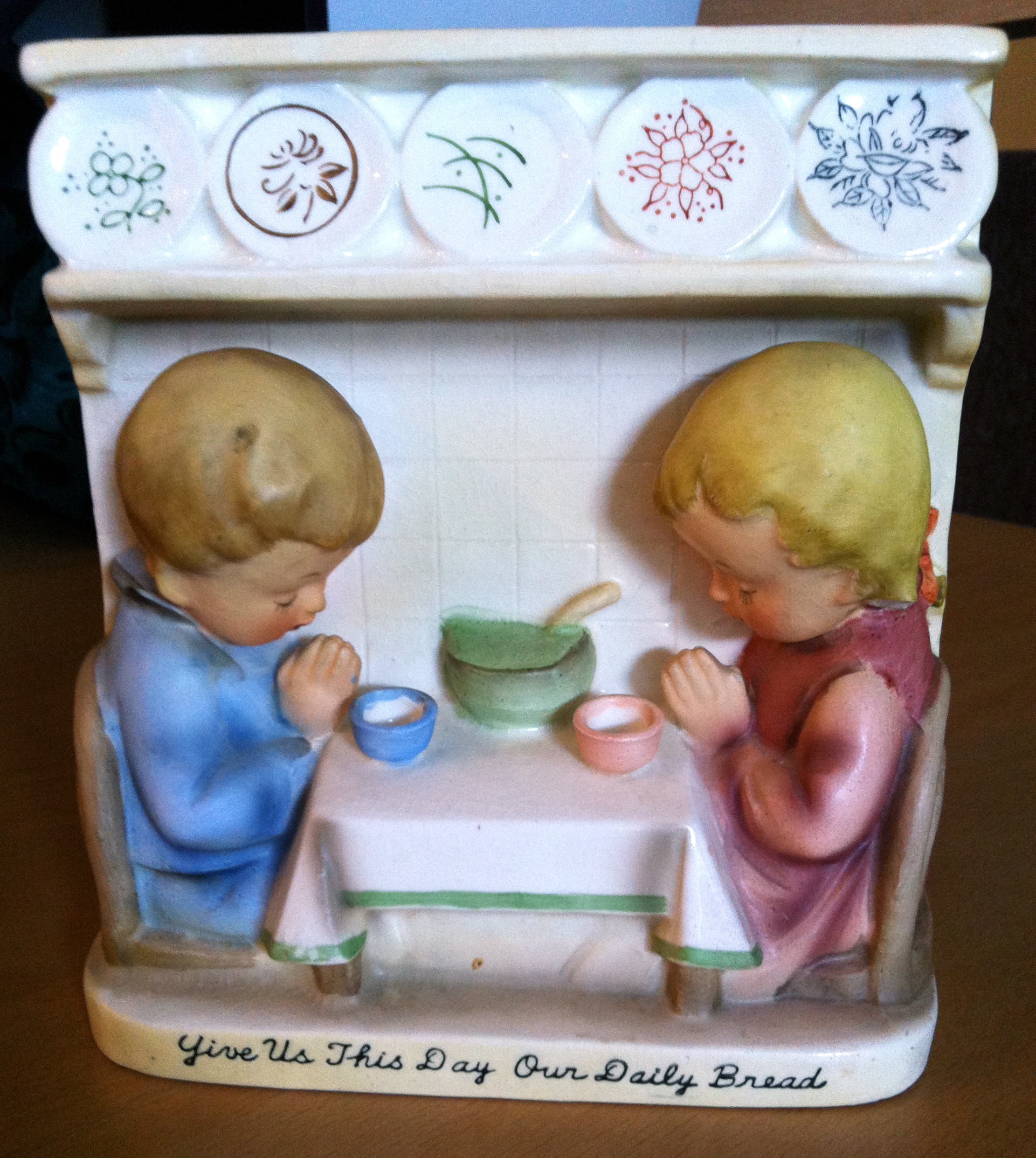 This is not a valuable ceramic by Doulton – just a made-in-Japan (literally) trinket. I remember as a kid being fascinated by the tiny bowls on the table, so tiny that I could fit my pinkie finger into each. While the religious message was clear enough – give us this day our daily bread – the diorama provided what was perhaps my earliest exploration of curiosity and imagination.