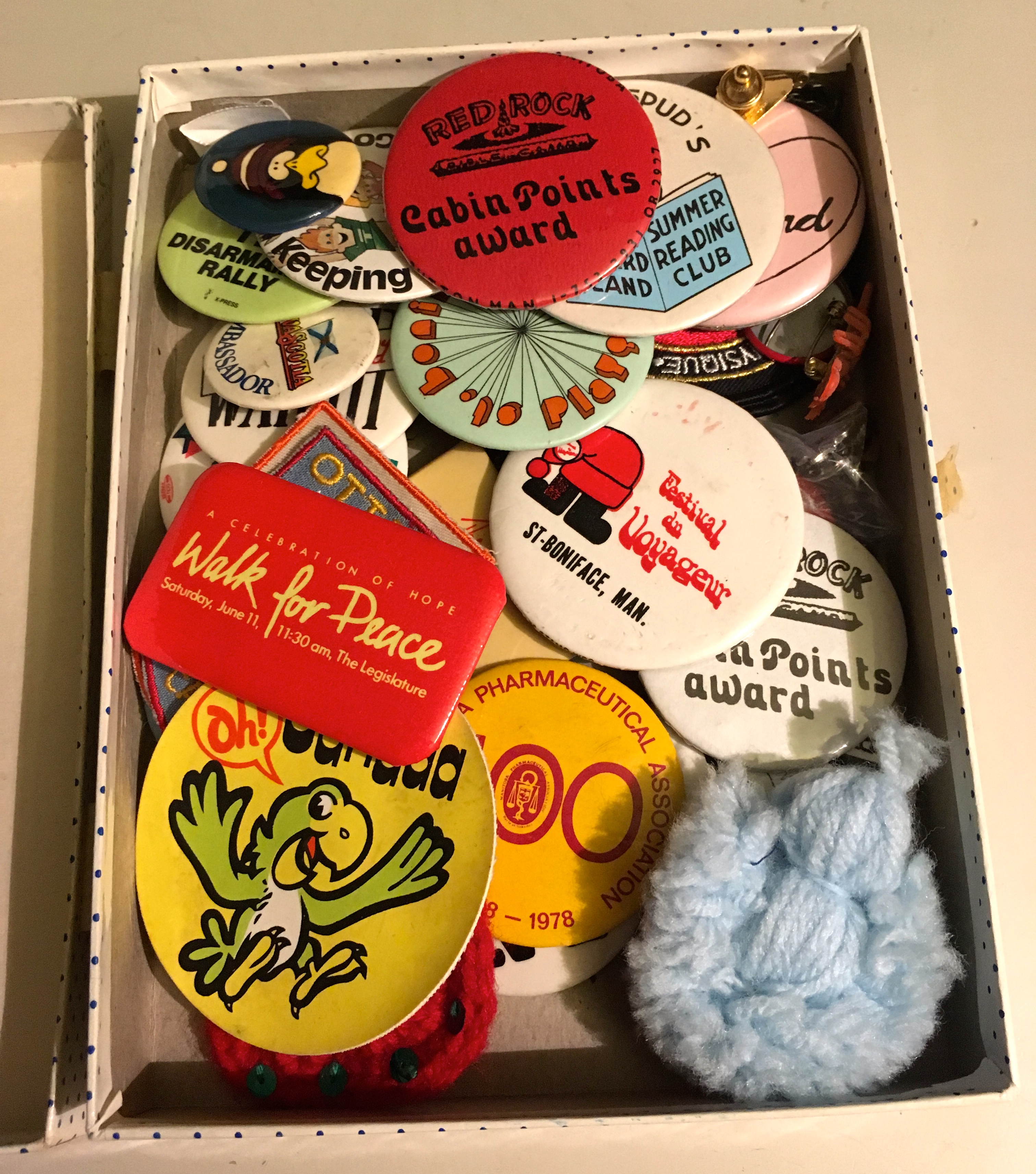 One of a collection of items kept in the brown suitcase, this small box contains a diverse collection of buttons, badges and lapel pins from various points in my childhood. Spilling the box out was little trip down memory lane. Various pins and buttons from places lived, events attended, and memorable dates, I remember having an idea about making a quilt or display of some kind for the whole set, but this old stationery box became the repository of these memorabilia. Some highlights: