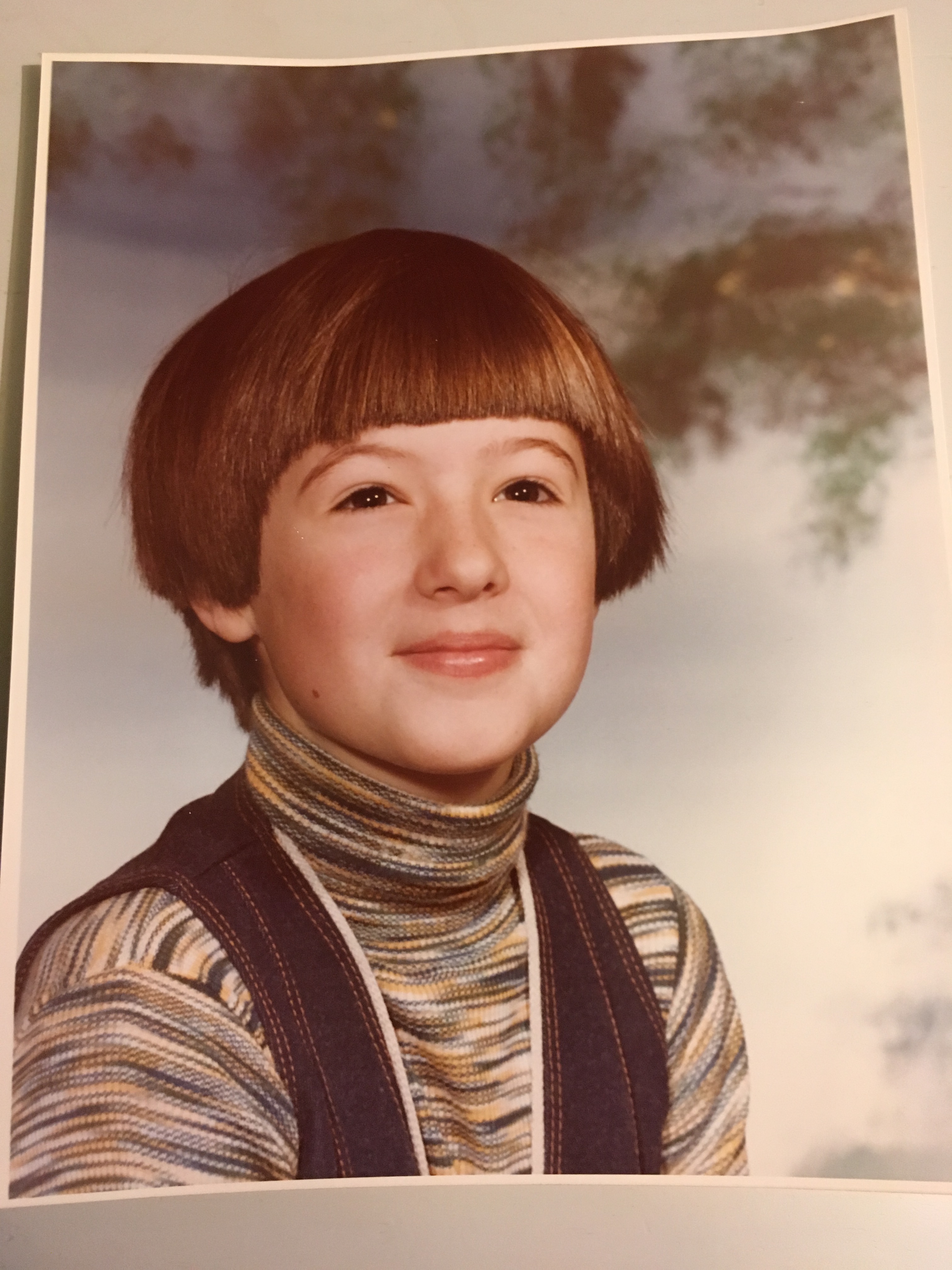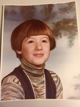 Alas, I do not have a class photo, just this school portrait of me, sporting the stylish pixie cut (home-made version) and the Seventies era denim vest (which I believe had a matching maxi-skirt). You can also see the white string conferring my latchkey kid status – something I was quite proud of but which would most-likely be illegal today.