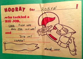 Mr. H. was a big proponent of incentivizing to instil good habits in kids, especially reading, physical fitness and responsibility. He challenged us with reading goals and then rewarded us with certificates of achievement. Ditto for sit-ups and push-ups – I keep this certificate as proof that I have actually done 1,000 push-ups in my life (which now only works out to 20 per year, but still…).
