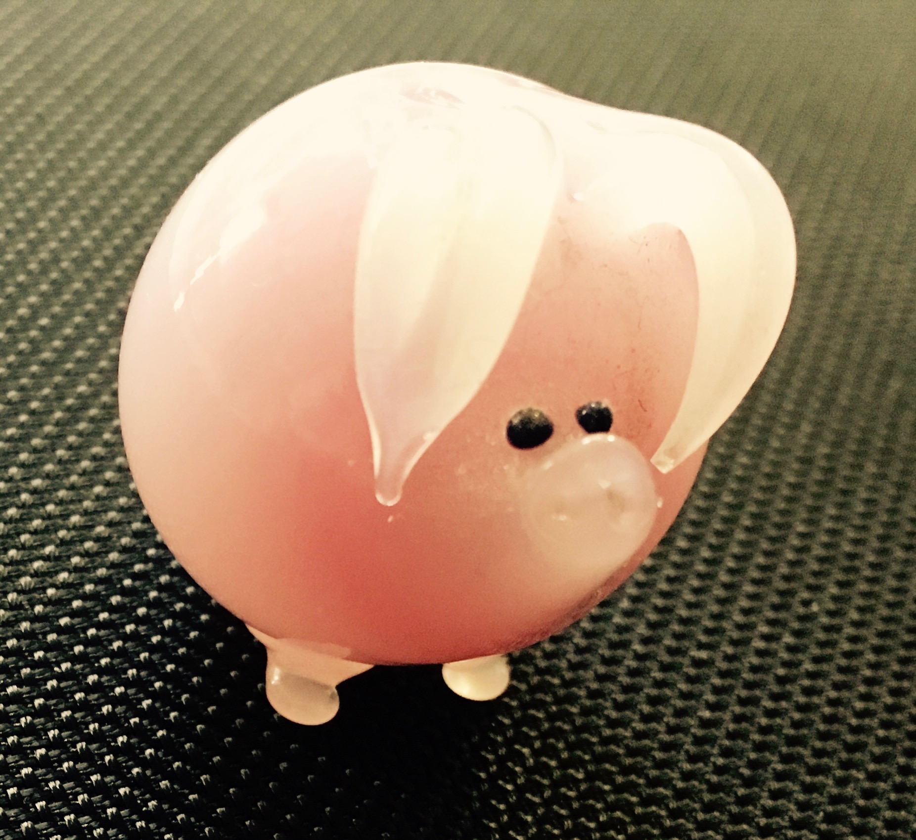 This little piggy has been with me since early high school days, a gift from my friend Angie. I seem to remember this was going to be part of a series of gifts, but no other farm animals or glass figurines made their way to me (not from Angie anyway – the cow theme emerged later). This one has cute ears, nose and tail, and has traveled with me through a dozen or more addresses, reminding me of an enduring friendship.