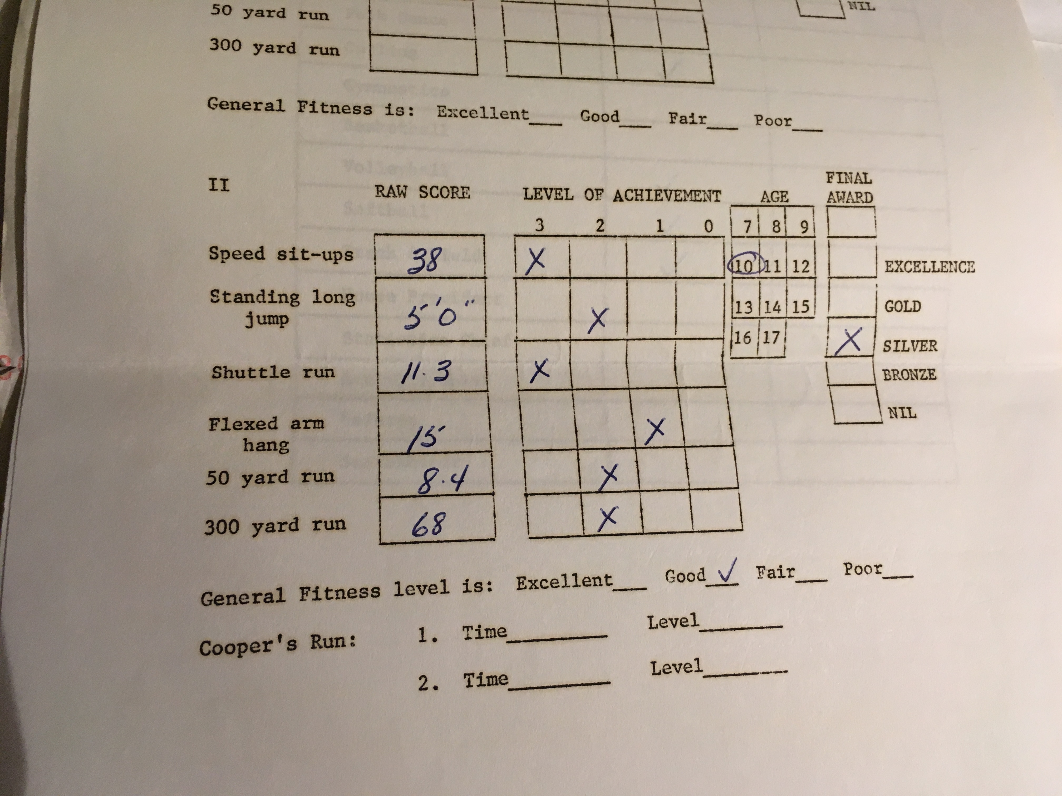 no recollection of my science fair project, other than the standard cardboard-box-display. I know it was not a volcano) and music classes, with the de rigueur recorder. It was the first year (for a while anyway) that I wouldn’t be class mates with Angie; she was a much better student than me, and so stayed with the “smart kids” in Grade 6, but we remained close friends, continuing with the sleepovers and good times. It was also the first year of the Canada Fitness Test, where I, unbelievably, received a silver award.