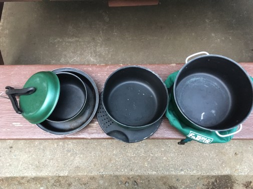 During a recent vacation, I was using this set of pots and pans and was reminded of its vintage. This set is now 25 years old, having been purchased in 1992 at the inauspicious start of my hiking and outdoor hobby. Back then, I had grand aspirations of travelling the world, getting back to nature and living from my backpack. It might have been something that a small part of my heart wanted, but my head, stomach and feet all objected to. After 25 years, the heart still wins occasionally, because there I was in the woods again a few weeks ago, chilled and damp but happy.