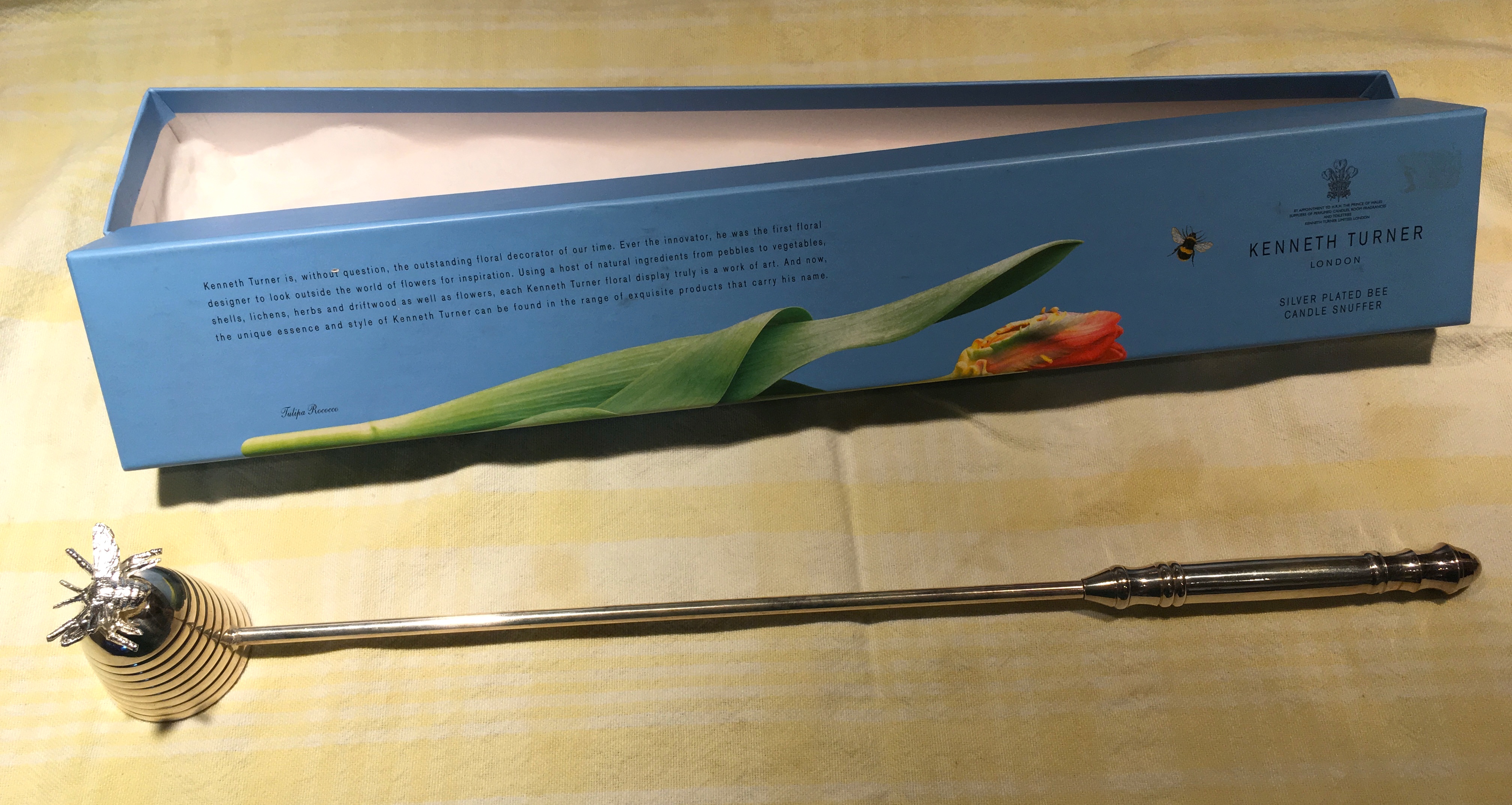 The item is a silver plated candle snuffer, in the shape of a beehive. It is not a trifling item – it is weighty both in provenance and mass. Kenneth Turner is purveyor of candles, fragrances and toiletries to the man who would be king, Prince Charles, so this is a snuffer with pedigree. It also weighs a considerable amount for a device intended for convenience: