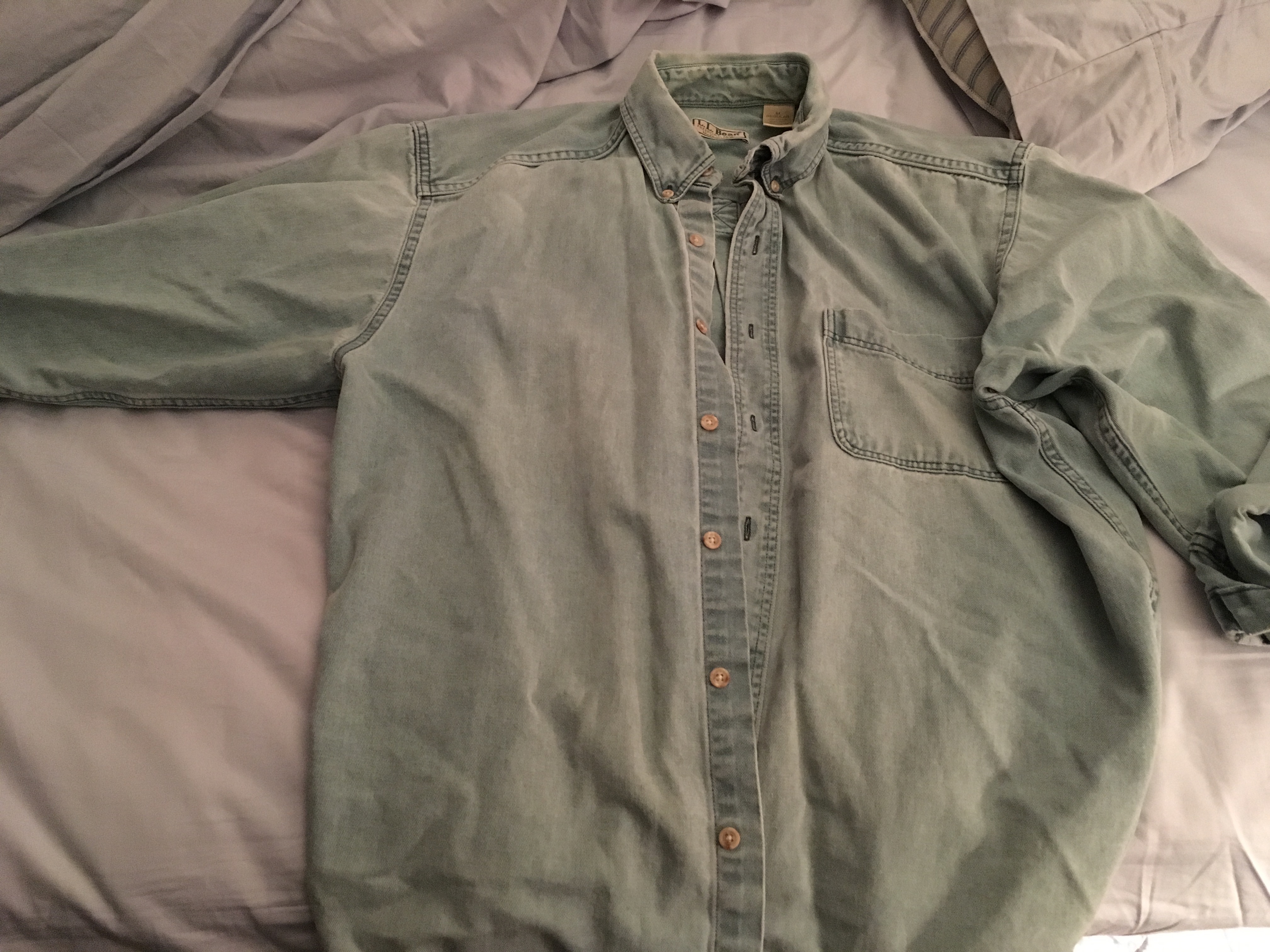 This article about an article of clothing reminded me of this item of mine. This green canvas shirt by LL Bean was given to me by my Pop nearly 25 years ago, and has become a treasured item and an example of clothing that lasts.
