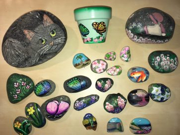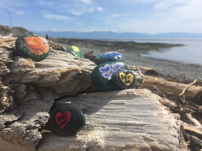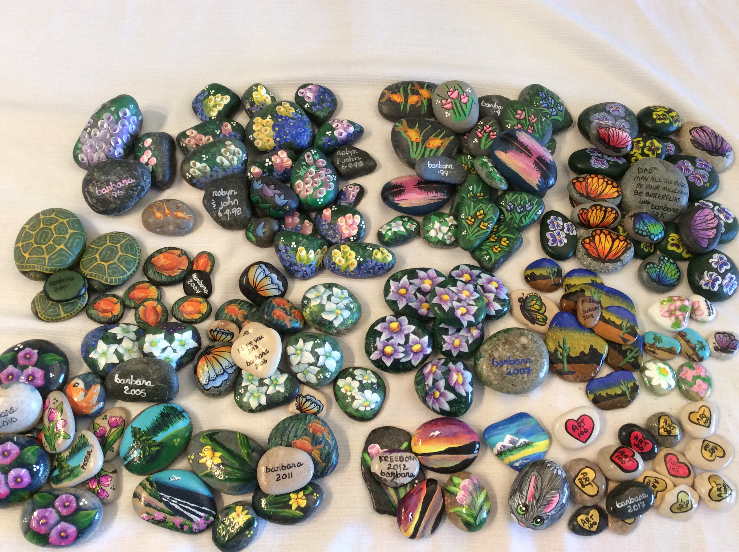Nearly 30 years ago, my mom began painting – first with watercolours but then in a variety of media that, in the mid-nineties, included painting on rock. She collects rocks of appropriate size and texture from the local beaches on Vancouver Island, as well as other locations that she visits in Canada and elsewhere. The images represent her world and life over time and are often commemorations of special moments and acknowledgements of change as life goes on. My collection includes – shown above:
