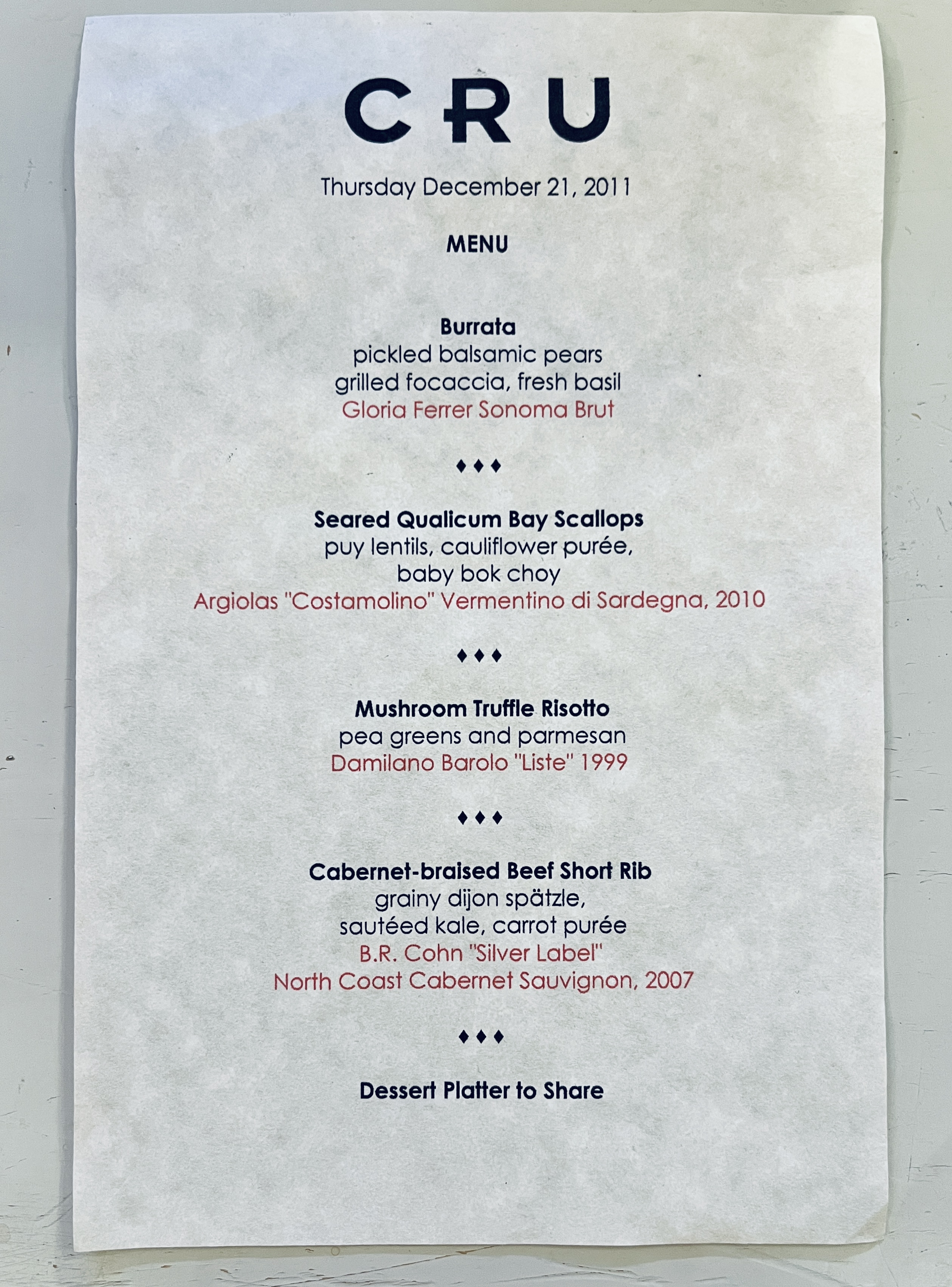 Cru closed less than six months later, and while I did have at least one more meal there before its last night, the evening with my three friends and that amazing meal will for me be the one I’ll always think of.