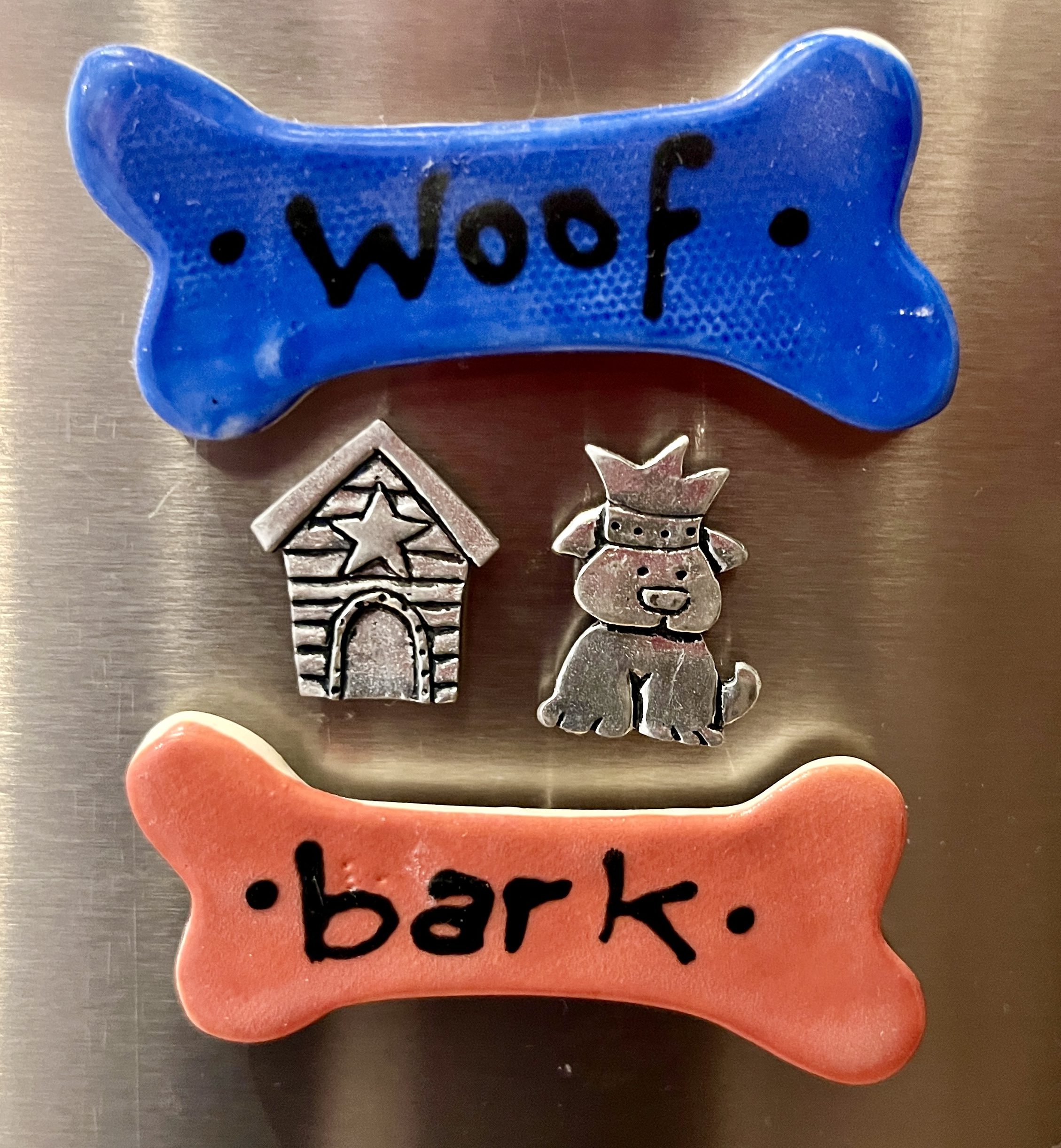 Most people use the face of their fridge* as a kind of bulletin board, photo album, directory, and home for miscellanea: kids artwork, school and vacation photos, take-out menus, business cards for plumbers and electricians, bills, brochures for events, timetables, mementos, oven mitts, note pads, recipes, utensils. While most of those items are ephemeral or transient, the devices we use to keep all of those in place – the fridge magnets – are lasting, often becoming a utensil in their own right. We pack them up when we move, we seek them out when they go missing, and sometimes we even mourn a little bit when they break or wear out. Like the things they hold to the fridge, the decorative magnet (for very rarely are they unadorned) can have its own meaning, as a memento of a vacation, a gift from a friend, or even a family heirloom.